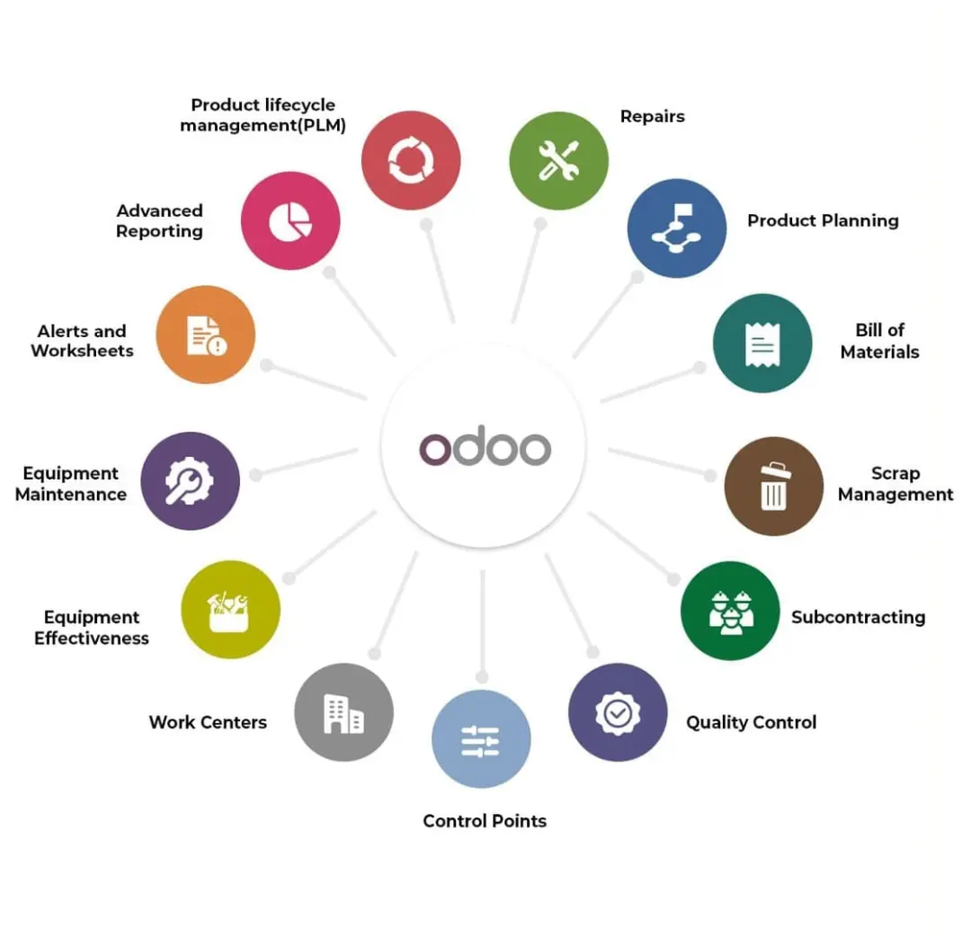 Odoo MRP, platformda Malzeme Gereksinimleri ve üretim sektörüne uygun planlama için mevcut olan özel aracı temsil eder. Dahası, bu tür özel araçlarla Odoo Manufacturing, bir şirketin tüm üretim operasyonel gereksinimlerini karşılayabilir ve bugün piyasada bulunan en iyi araçtır.
