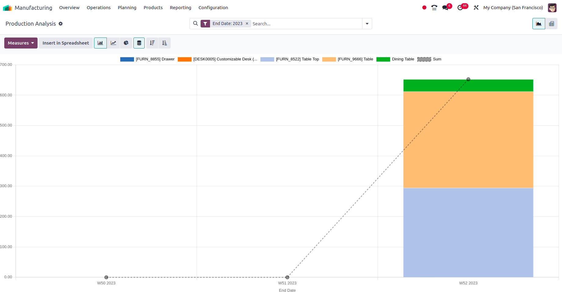 Rapor oluşturma, Odoo'nun gelişmiş yeteneklerinden biridir ve üretim operasyonları için, operasyonların her biri için özel analitik raporlar üretebileceksiniz.